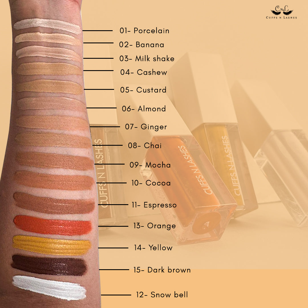 Achieve flawless, natural-looking skin with the Cuffs N Lashes Cover It All Liquid Concealer. This highly pigmented yet lightweight formula provides full coverage for dark circles, blemishes, and redness. Its smooth, blendable texture ensures a crease-free finish that lasts all day.